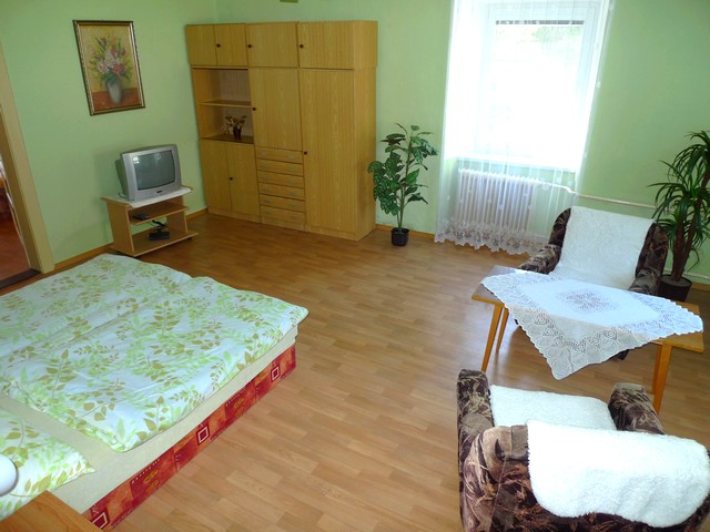 Ložnice 4 (může sloužit také jako společenská místnost): 1x1 lůžko, stůl + židle, sedací souprava, TV