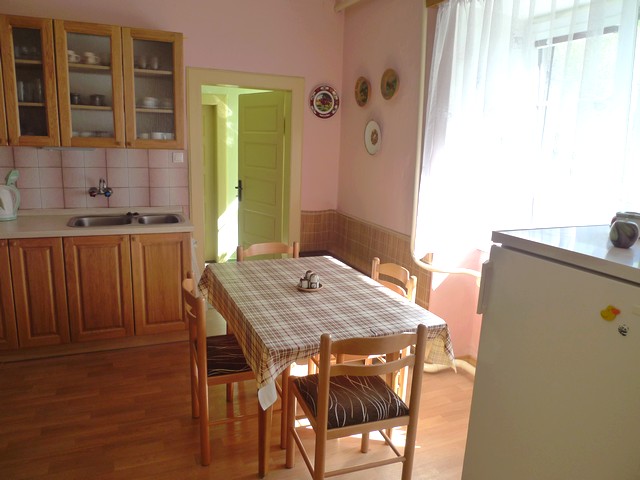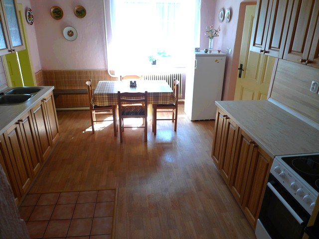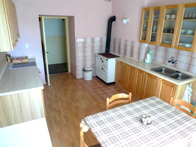 Kuchyně: kuchyňská linka, el. sporák + trouba, chladnička (120 l), jídelní stůl + 4 židle, MW trouba, varná konvice