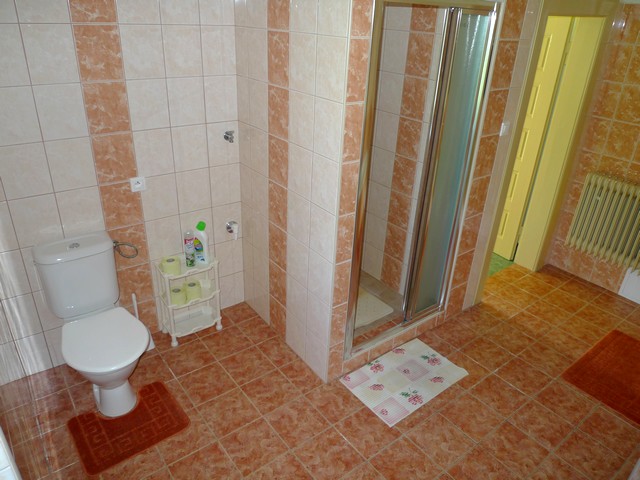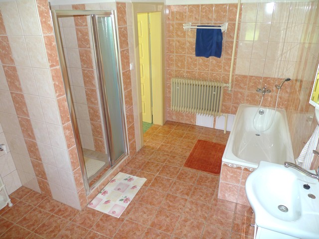 Koupelna: vana se sprchou, umyvadlo, sprchový kout, WC
